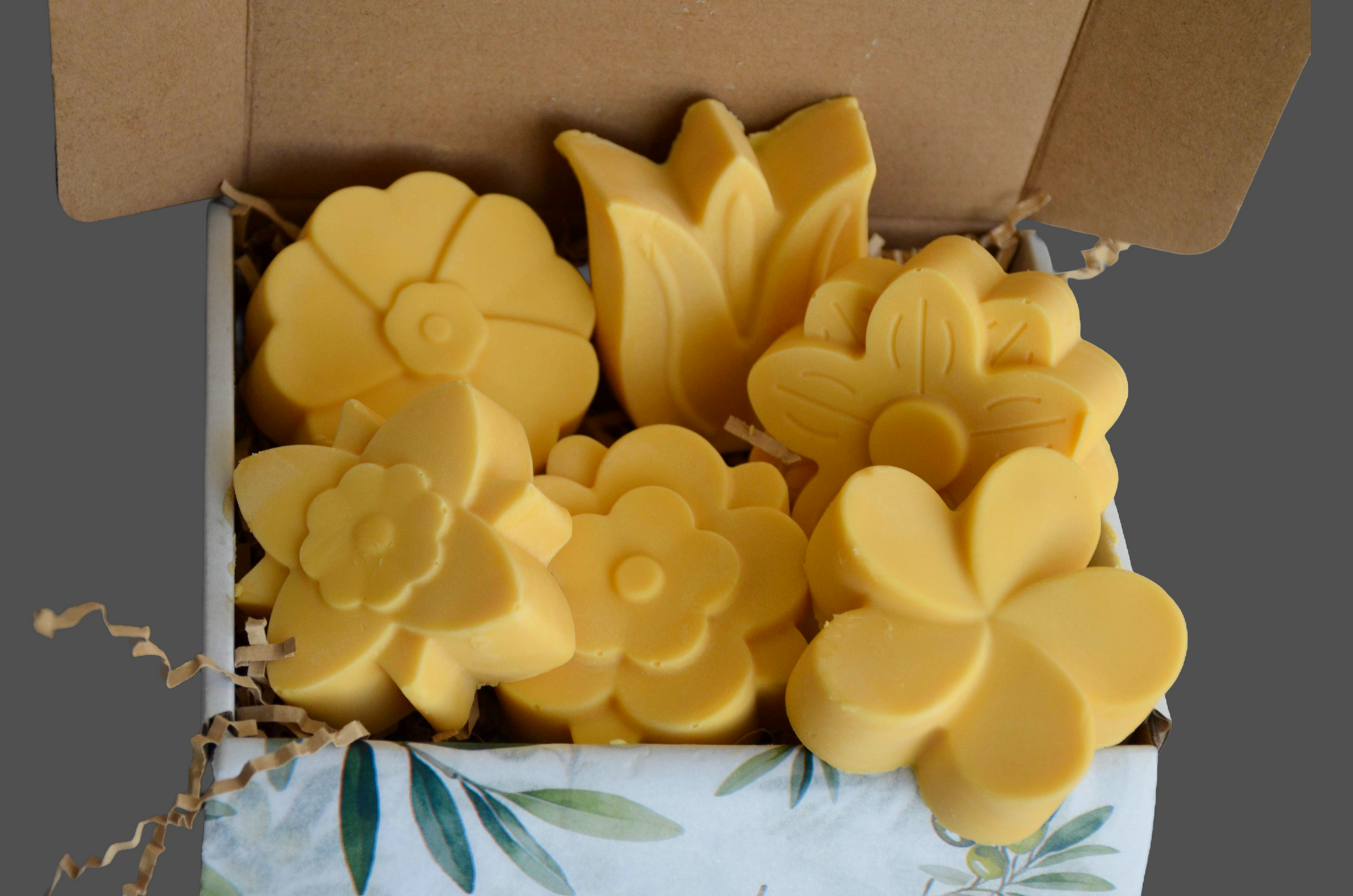 • Set of 6 assorted Flower-shaped soaps (approximately 3 oz each)